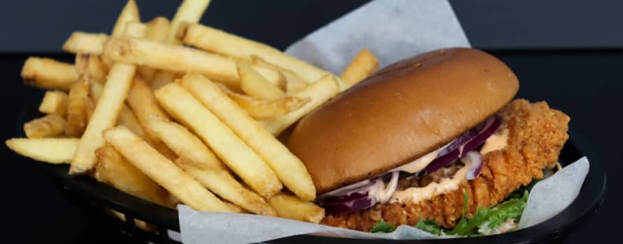 ENG: Spicy chicken │ Red onion │ Crisp lettuce │ Sriracha & honey mayo │ Brioche