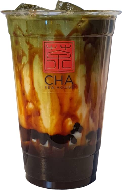 Ice cold Matcha Latte with caramelized brown sugar served with tapioca pearls. This drink is free from gluten and lactose.