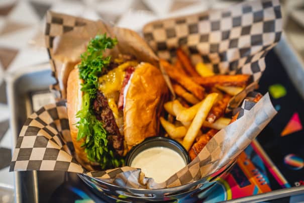 Pommes, sallad, picklad rödlök, dubbel cheddarost, bacon, stark BBQ sås & chipotlemajo.