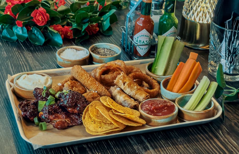2 mozzarellasticks, 2 kycklingvingar, 4 lökringar, 2 chilicheese, 2 vegetariska vårrullar, nachos, morotsstavar, selleristavar & gurkstavar. Serveras med aioli och salsa Har du frågor gällande allergier? Fråga gärna våra kunniga kollegor.