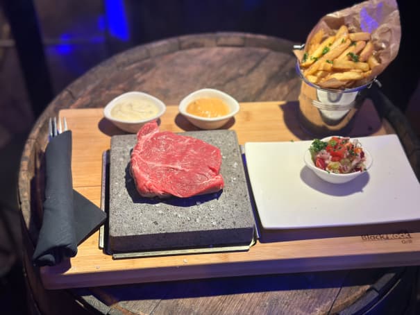 Dessa rätter serveras på en het lavasten som hettas upp till ca 460grader. På denna heta lavasten bestämmer du din egna stekgrad. Serveras med bearnaise sås, chili mayo och pommes frites. Toppas med en chili.