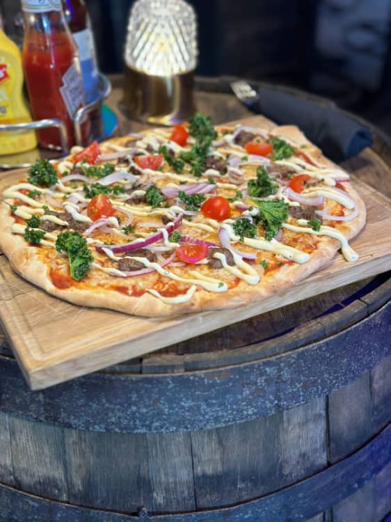 Tomatsås, riven mozzarellaost, oxfilé, toppad med skivad silverlök, grönkål och ringlad bearnaisesås.