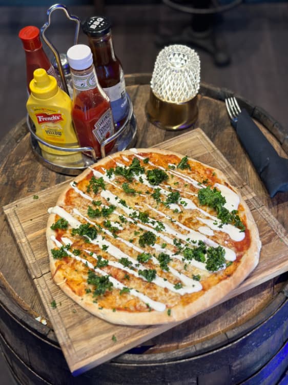 Tomatsås, riven mozzarellaost, toppad med grönkål och ringlad gräddfil.