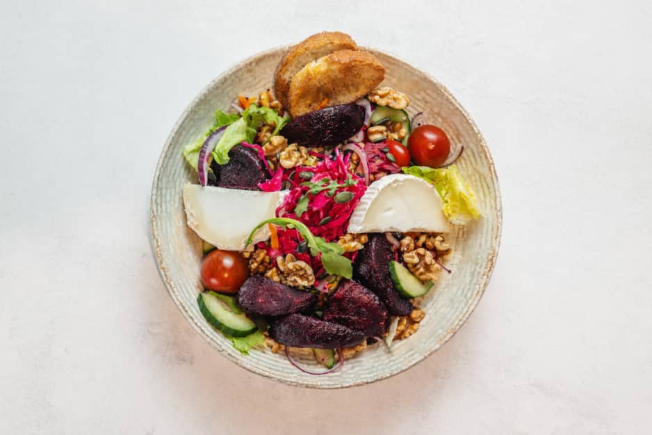 Krispig salladsgrund med Chevré, Rödbetor & krispiga Valnötter. Toppas med Picklad rödkål, Ruccola, Pumpafrön & Krutonger Välj till någon av våra goda & egengjorda dressingar!