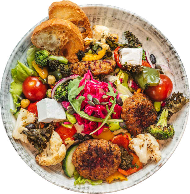 Krispig salladsgrund med vår smakrika Rödbetsfalafel, Grillad Paprika, Grillad Broccoli & Blomkål, Vitost, Marinerad Bönmix och Grönkålschips. Toppas med Picklad Rödkål, Ruccola, Pumpafrön & Krutonger Välj till någon av våra goda & egengjorda dressingar!