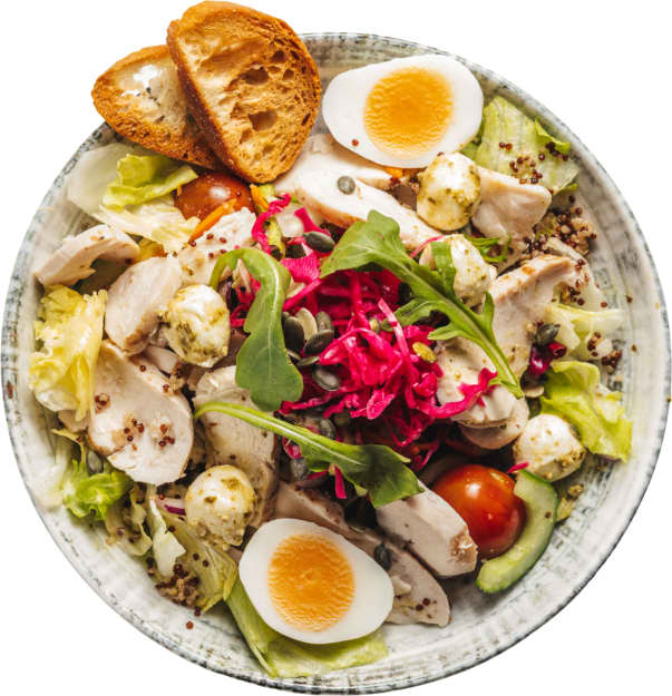 Krispig salladsgrund med Svensk Kyckling, Mozzarella med pesto & Ägg. (Peston innehåller cashewnötter) Toppas med Picklad Rödkål, Ruccola, Pumpafrön & Krutonger Välj till någon av våra goda & egengjorda dressingar!
