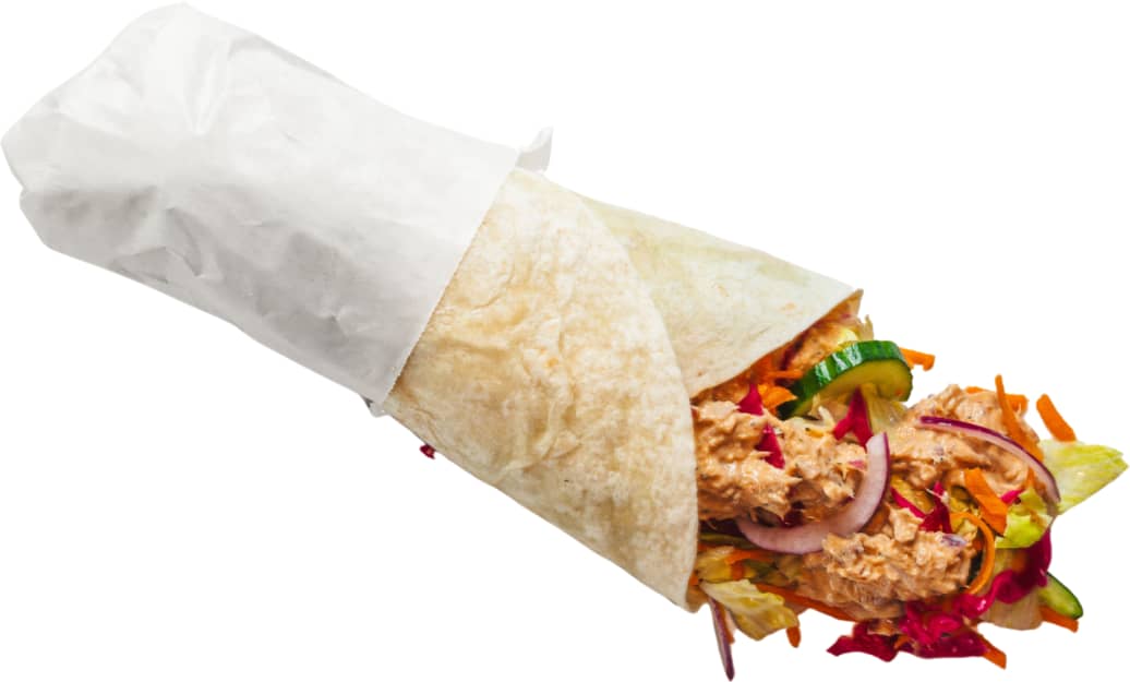 Tortilla bröd med fyllning : Spicy Tuna, Isbergsallat, Gurka, Rödlök, Morötter, Ruccola & Picklad Rödkål, Valfri Dressing. Innehåller gluten.