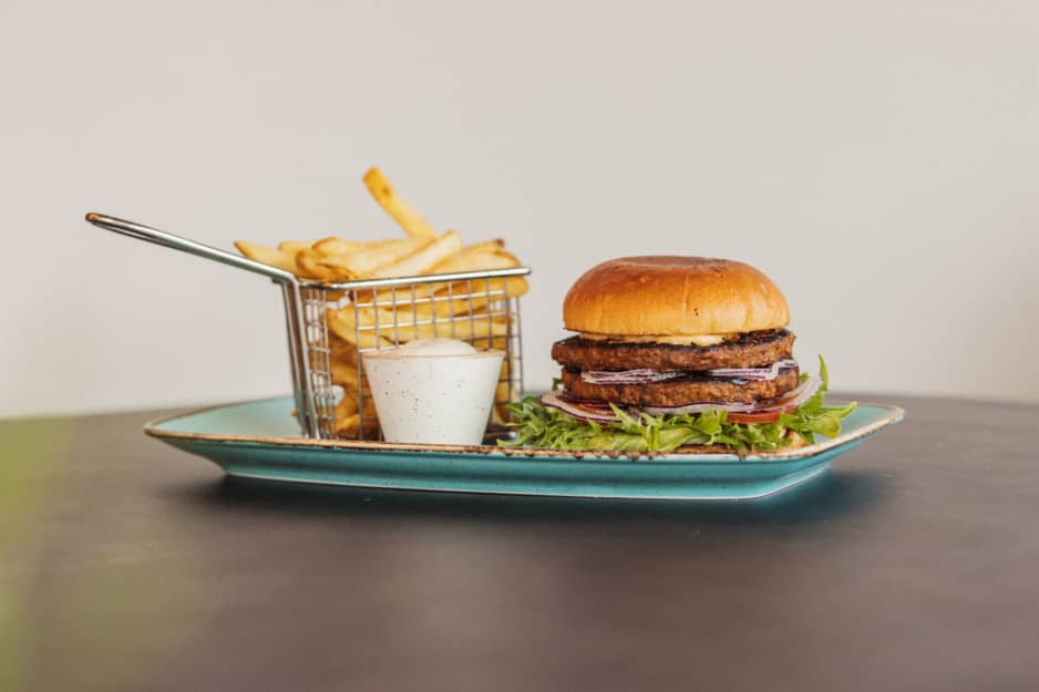 Sallad, tomat, picklad rödlök, cheddarost, parmesanaioli, och pommes med vitlöksdipp