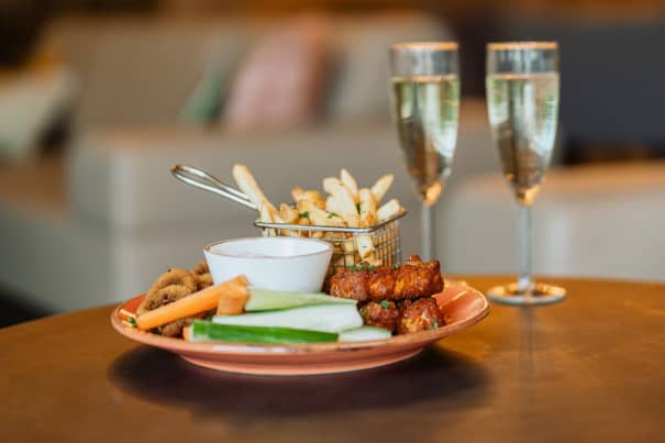 Potato pops, lökringar, halloumisticks, morot, gurka och vitlöksdipp