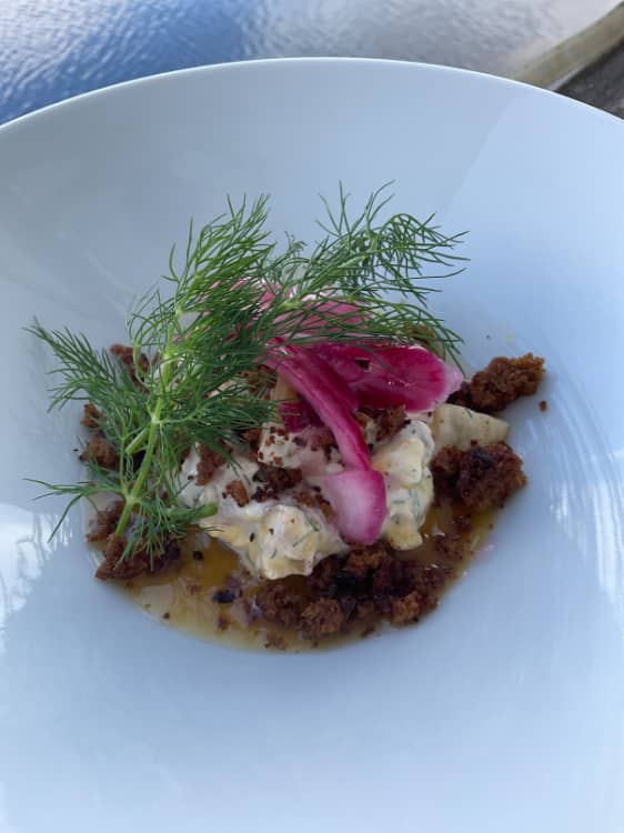 Matjessill, rödlök, ägg, dill, potatis, majonnäs, brynt smör, syrad rödlök på danskt rågbröd Innehåller Gluten,laktos
