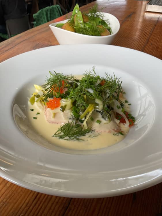 Röding serveras med sandefjordssås, färskpotatis slungad i smör, dillolja, picklad fänkål & purjolök, citrongravad regnbågsrom. Innehåller laktos