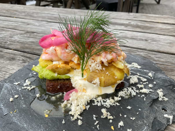 Räkor, dill, potatis, ägg, brynt smör, pepparotskräm, toppas med rödlök & färskriven pepparot på danskt rågbröd