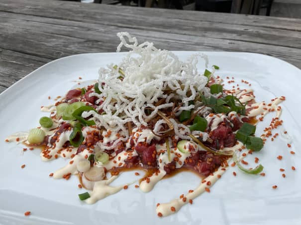Nötrulle, sesamolja, salladslök, yuso soyamajonnäs, friterad purjolök, picklad svamp, chili rostade sesamfrön, friterade risnudlar