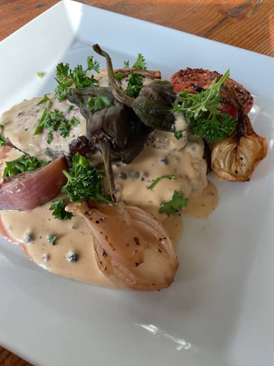 På rostas, Hamnkrogens pepparsås, stekt lök, tomat, padrones, crispy fries Innehåller laktos