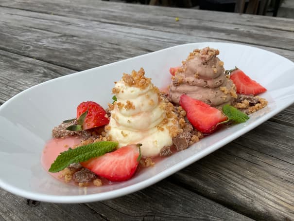 Vit & mjölkchoklad kräm med rabarber gelé med jordgubbar rostad vit choklad och havresmul Innehåller: gluten, laktos