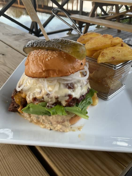 Smashed burger med bacon jam, chili, amerikansk bbq dressing, tomat, romansallad, silverlök, saltgurka och crispy fries. Innehåller gluten, ägg, laktos