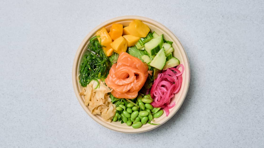 Rå lax eller tonfisk, wakamesallad, picklad rödlök, edamamebönor, picklad ingefära, gurka och mango, vårlök & sesamfrön Dressing: chiliaioli & teriyakisås