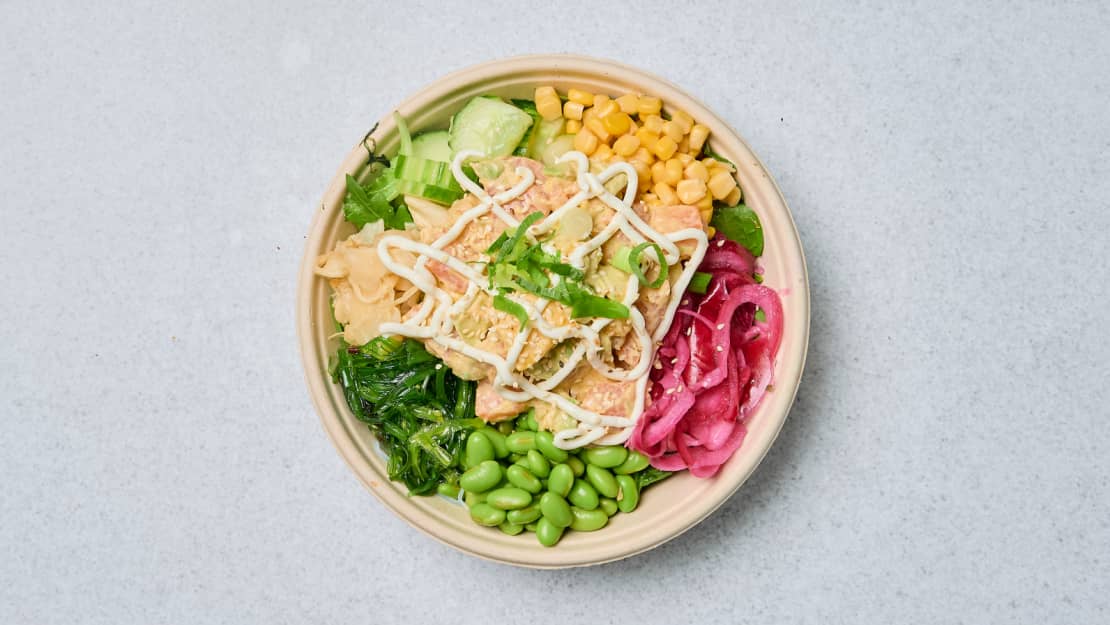 Laxtartar eller tonfisktartar, wakamesallad, picklad rödlök, edamamebönor, picklad ingefära, gurka, avokado, majs & sesamfrön Dressing: Yuzu dressing