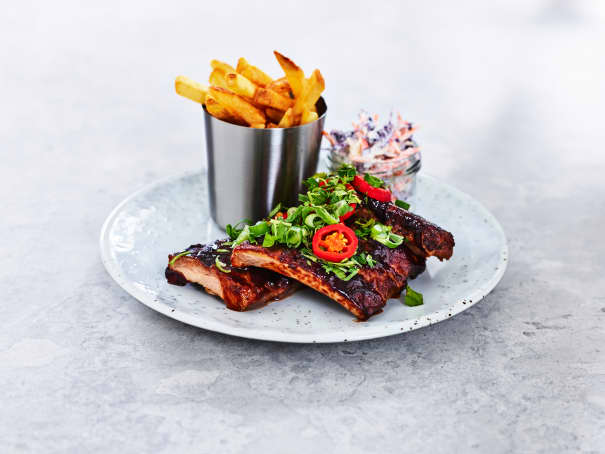 Saftiga baby back ribs glaserade med O'Learys bourbon BBQ sås, toppade med picklad jalapeno, gräslök och lite koriander. Serveras med pommes frites, friterade lökringar och coleslaw