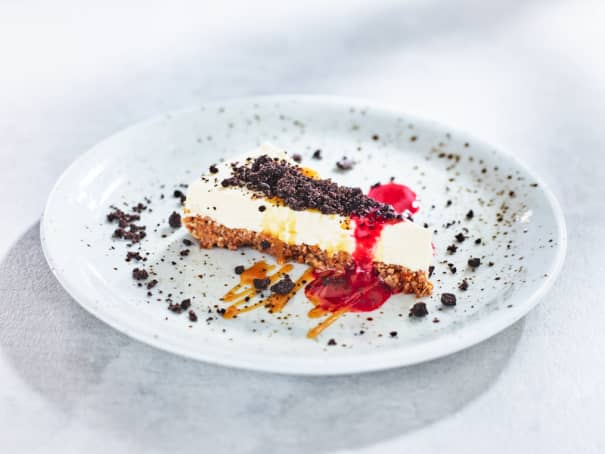 Krämig vaniljcheescake toppad med pecannötter,kolasås och hallonsås.