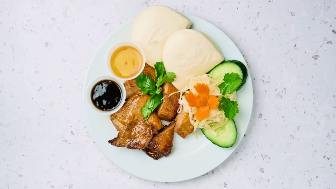 Friterad pekinganka. Serveras med ångkokta mantao buns, vitkålssallad, teriyakisås och plommonsås