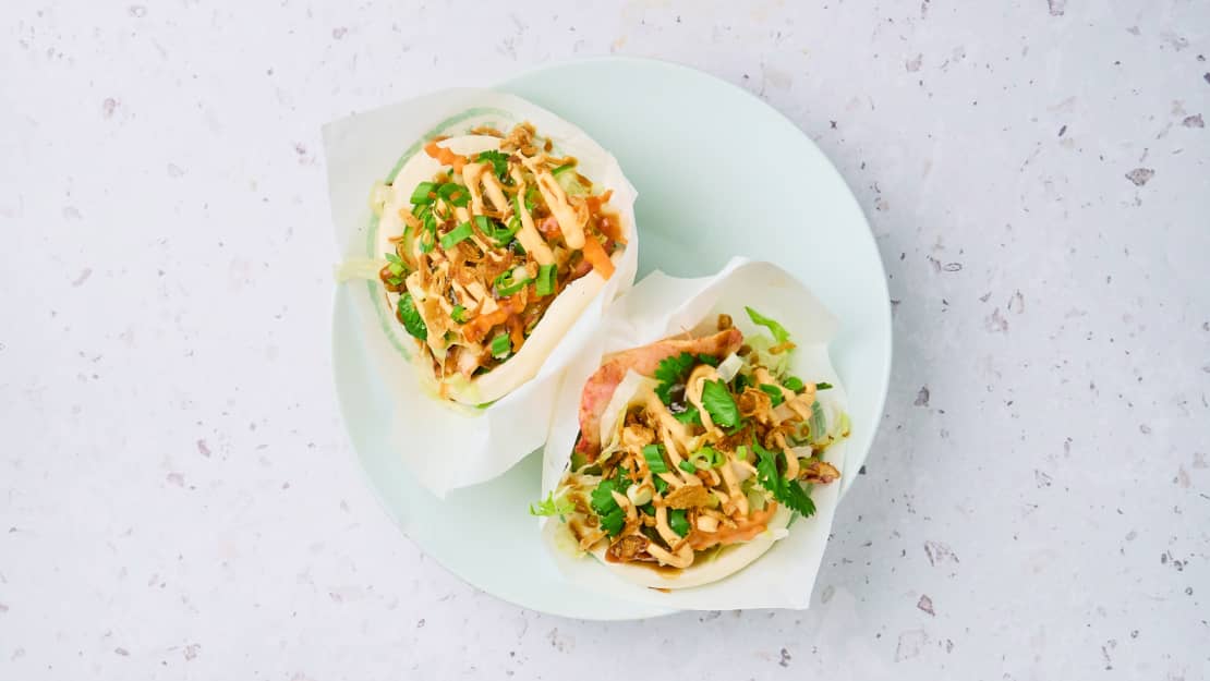 Ångkokta buns, valfritt kött, krispiga vietnamesiska pickles, koriander, picklad rödlök, grönsallad, rostad lök, toppat med husets BBQ-sås