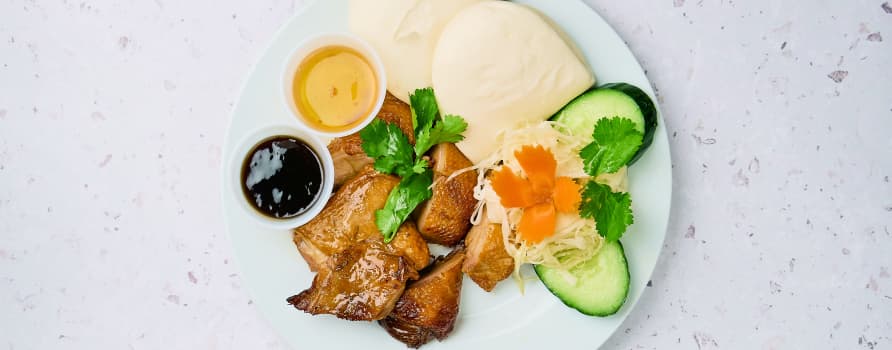Friterad pekinganka. Serveras med ångkokta mantao buns, vitkålssallad, teriyakisås och plommonsås