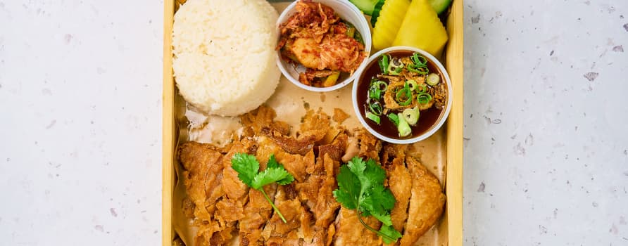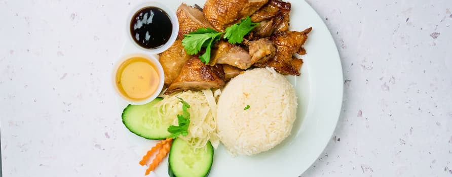 Friterad pekinganka. Serveras med ris, vitkålssallad, plommonsås och teriyakisås