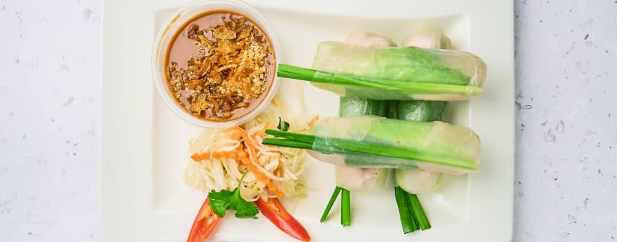 Sommarrullar med rispapper, risnudlar, isbergssallad, kinesisk gräslök, basilika, gurka och mynta. Serveras med fisksås eller jordnötssås