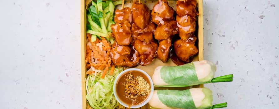 Friterad kycklingspett med BBQ-sås och sommarrullar fyllda med kyckling Serveras med picklade morötter, wakamesallad, gurka och jordnötssås