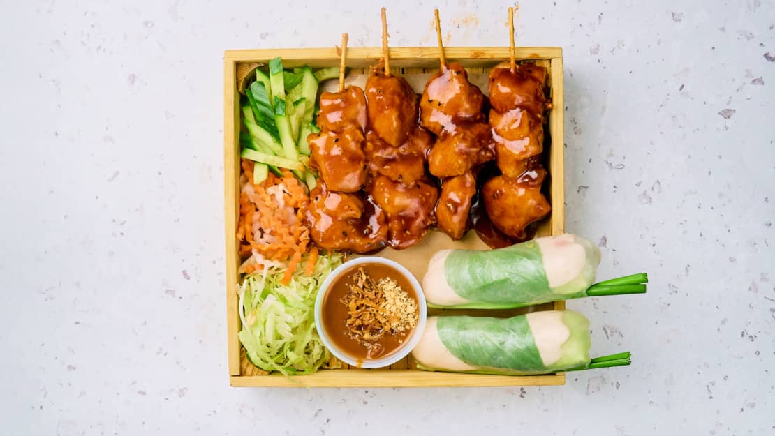 Friterad kycklingspett med BBQ-sås och sommarrullar fyllda med kyckling Serveras med picklade morötter, wakamesallad, gurka och jordnötssås