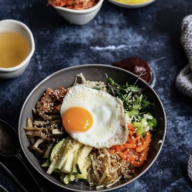 Serveras som en skål med varm ris toppad med kalla inlagda grönsaker, stark sås och ett stekt ägg på.