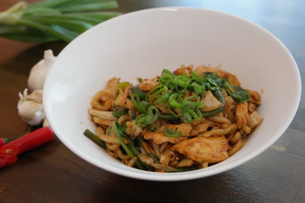 Stekta japansk udonnudlar med kyckling, räkor, ägg och grönsaker i starksås. Toppad med sesam