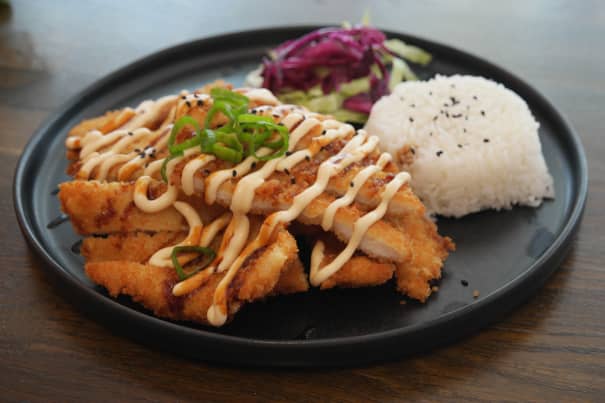 Krispig friterad kycklingfilé med japansk pankobröd. Toppad med chilimajo, teriyakisås och sesam. Serveras med ris.