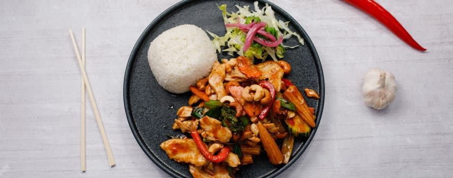 Wokade kyckling med grönsaker och cashewnötter. Serveras med kokt ris