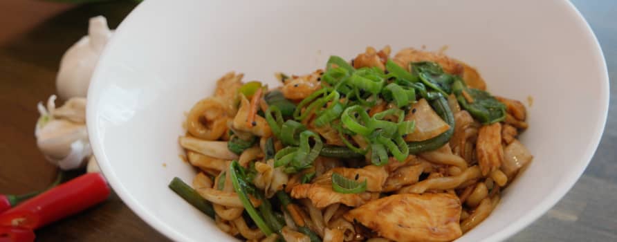 Stekta japansk udonnudlar med kyckling, räkor, ägg och grönsaker i starksås. Toppad med sesam
