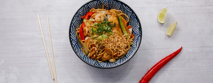 Stekta risnudlar med kyckling, räkor, ägg och grönsaker i tamarindsås. Toppad med lime & jordnötter