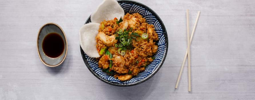 Stekt ris i thailändsk chilisås med kyckling, räkor, ägg och grönsaker.