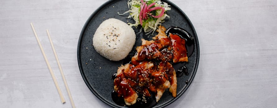 Teppanyaki kyckling, toppad med vår egen teriyakisås och sesam. Serveras med kokt ris