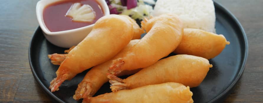 Japanska friterade jätteräkor. Toppad med chilimajo, teriyakisås och sesam.