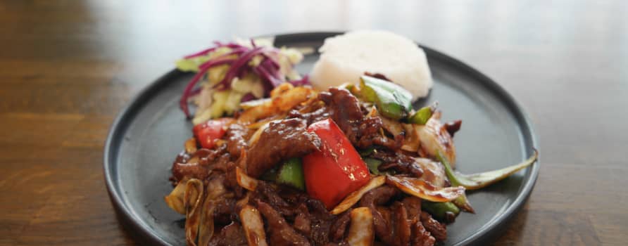 Wokade ryggbiff med lök och paprika i kockens egen vitlök och chilisås. Serveras med kokt ris