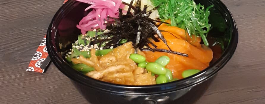 Ris toppad med rålax, avokado, tofu, bönor, wakame, gari, picklad rödlök och sesam. Serveras med soja