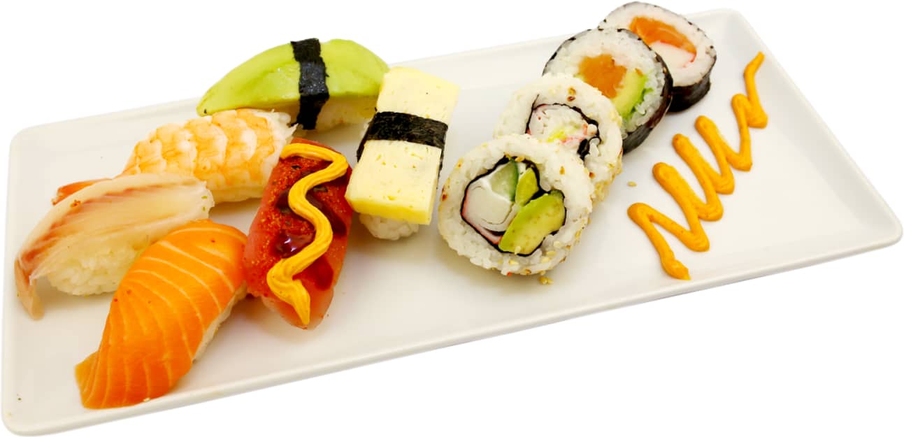 (Lax,tonfisk, vitfisk,räkor, omelet, avocado, 4 blandademaki)