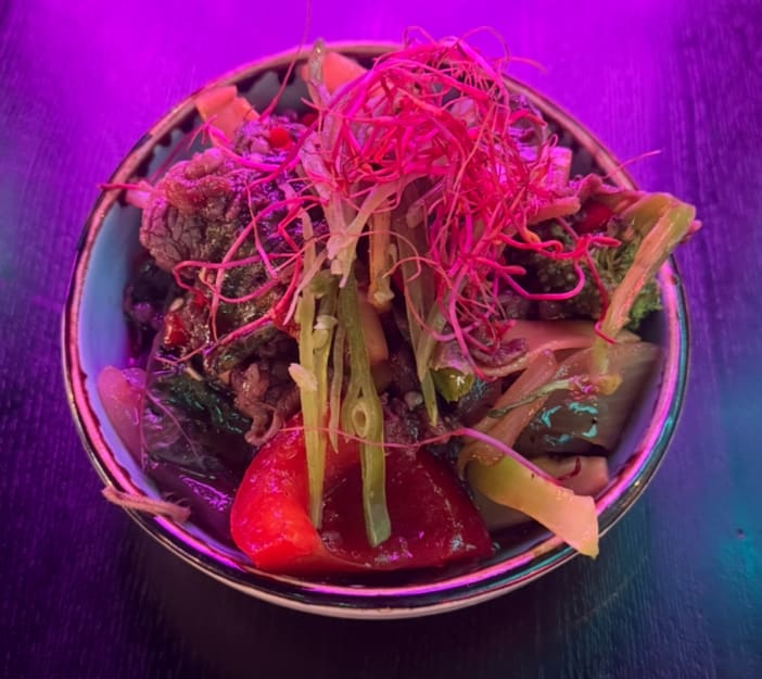 Wok med stark chili, vitlök, säsongens primörer samt färsk basilika. ( chili 3 ) Ta ej rätten om ni inte är chilli varna!Välj EJ CHILI Stir-fried with hot chili, seasonal vegetables and fresh basil.