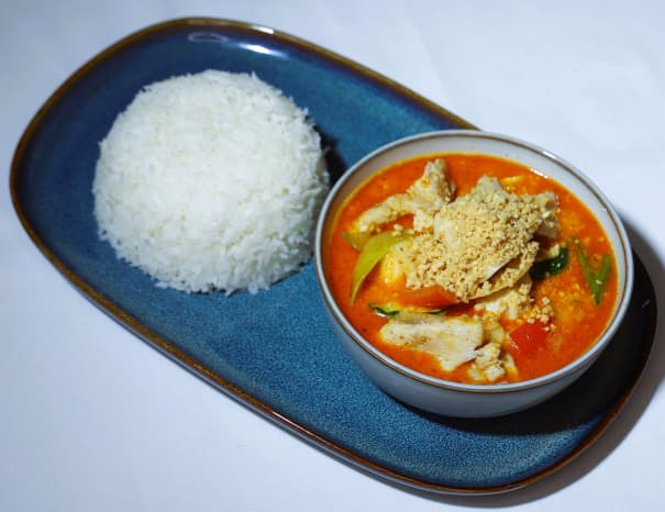 Massamancurry, kokosmjölk, lök, morötter, zucchini, vitkål, jordnötter paprika och purjolök.