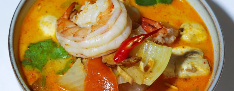 Räksoppa med chilipasta, galanga, citrongräs, limeblad, lök, tomat & champinjoner. (2 räkor)Stark