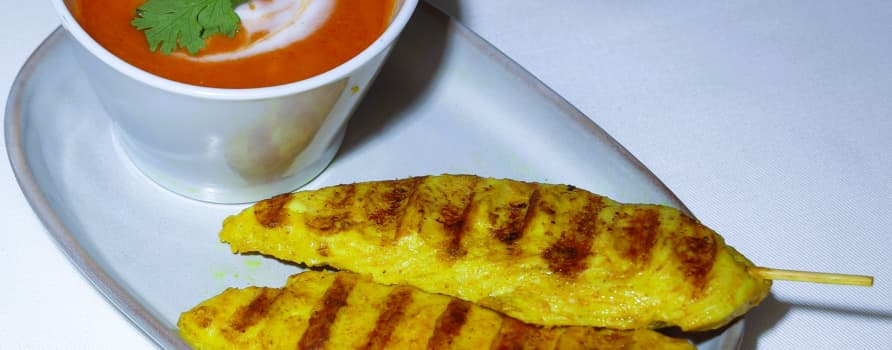 4st Kycklingspett, serveras med jordnötssås och ris.