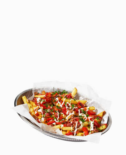 Krispiga pommes frites som toppas med bacon, jalapeño, pico de gallo, finhackad persilja och aioli.
