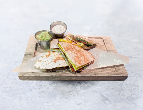 Tortilla med Oumph, het pico de gallo och smält vegansk ost. Serveras med guacamole och vegansk yoghurt