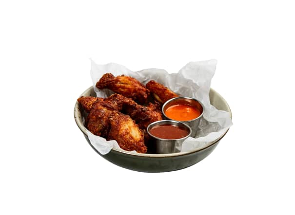 Friterade kycklingvingar som serveras med hot buffalo red sauce och en söt aprikosglaze.